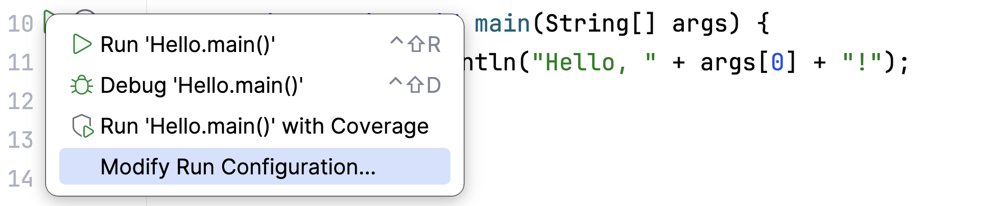 To specify program arguments in IntelliJ, click the green play button next to the main() method signature and select “Modify Run Configuration…”