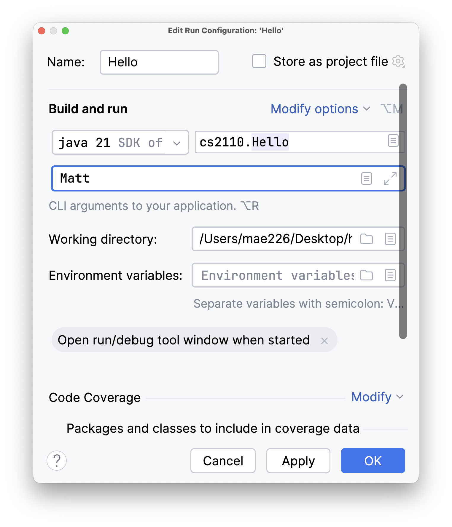 After entering the program arguments, click “Apply” and then “Okay” to close this window. Now, when you run the program (by following the steps from above), IntelliJ will supply your provided program arguments to the Java runtime.
