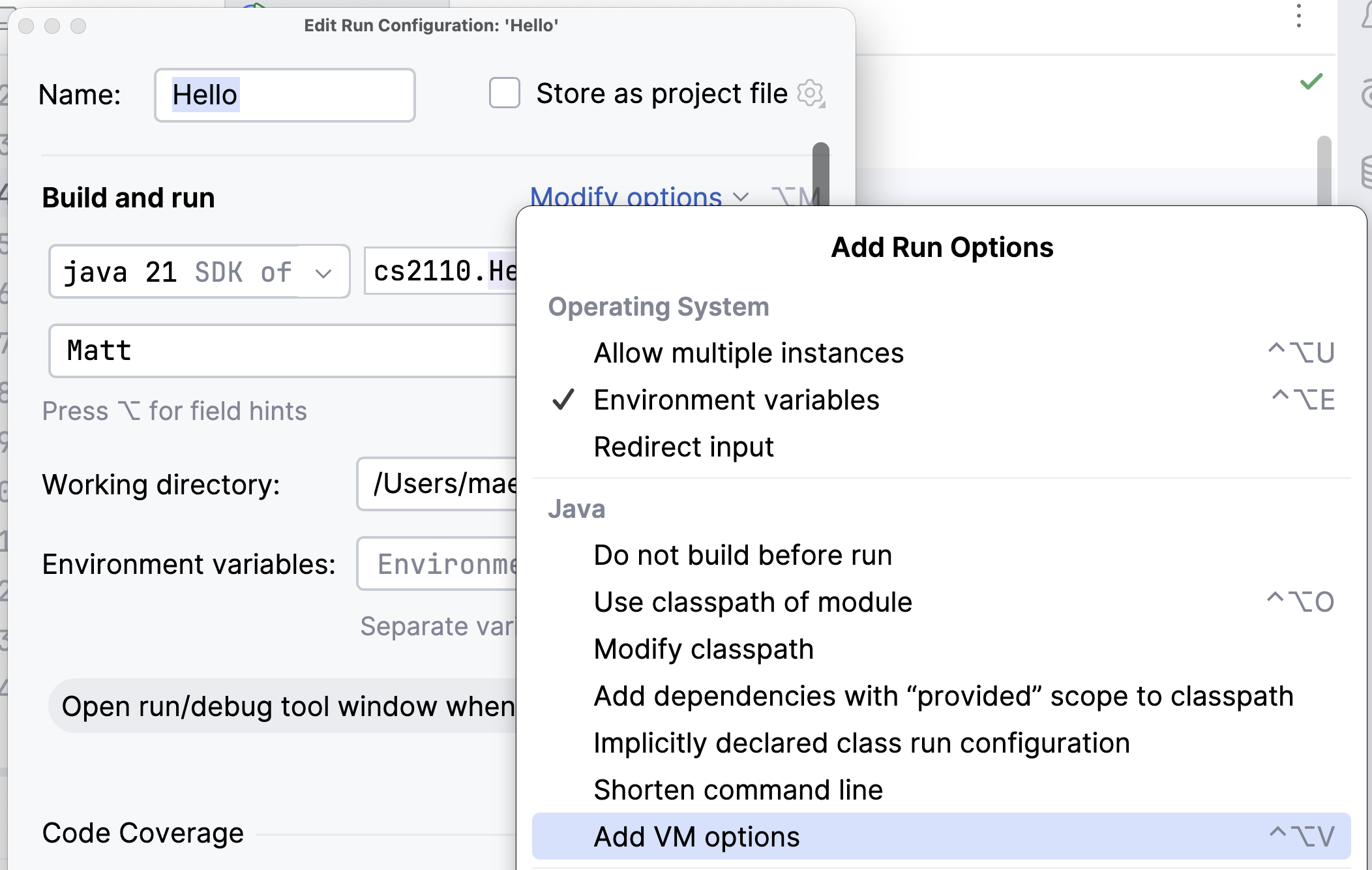 Throughout the course, we will emphasize the benefit of using assert statements to validate the correctness of your code. Unfortunately, Java ignores these assert statements by default; you need to manually enable them. To do this, we must supply the -ea flag to the Java virtual machine. To do this, open the “Edit Run Configuration” window as described in the previous section. At the top, you’ll see a blue dropdown link to “Modify options”. Click this and select “Add VM options”.