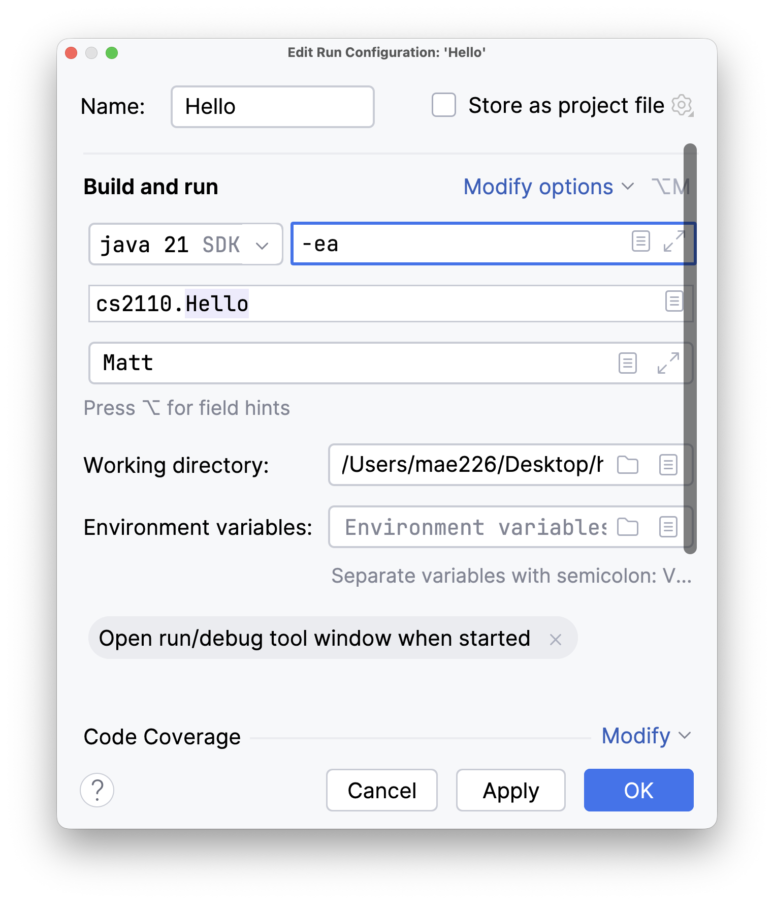 Click “Apply” and then “Okay” to close this window. Now, when you run the program (by following the steps from above), IntelliJ will ensure that this is done with assert statements enabled.