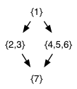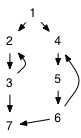In the second phase, we start with 1 and find it has no predecessors, so {1} is the first SCC. We then start with 4 and find that 5 and 6 are reachable via backward edges, so the second SCC is {4,5,6}. Starting from 2, we discover {2,3}, and the final SCC is {7}. The resulting DAG of SCCs is the following:
