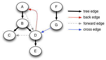 Note that the classification of edges depends on what trees are constructed, and therefore depends on what node we start from and in what order the algorithm happens to select successors to visit.
