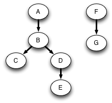 DFS starting at A will not search all the nodes. Suppose we next choose F to start from. Then we will reach all nodes. Instead of constructing just one tree that is a subgraph of the original graph, we get a forest of two trees: