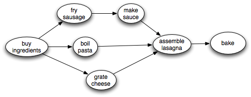 There is some flexibility about what order to do things in, but clearly we need to make the sauce before we assemble the lasagna. A topological sort will find some ordering that obeys this and the other ordering constraints. Of course, it is impossible to topologically sort a graph with a cycle in it.