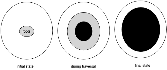 The progress of the algorithm is depicted by the following figure. Initially there are no black nodes and the roots are gray. As the algorithm progresses, white nodes turn into gray nodes and gray nodes turn into black nodes. Eventually there are no gray nodes left and the algorithm is done.