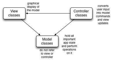 This observation leads to the Model-View-Controller pattern, in which the application classes are separated into one of three categories: the model, which contains the important application state and operations, and does not refer to the graphical UI classes; the view, which provides a graphical view of the model; and the controller, which handles user input and translates it into either changes to the view or commands to be performed on the model.
