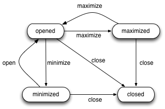 As a simple example, consider a window in a graphical user interface. Simplifying a bit, it can be in the following states: opened, closed, minimized, or maximized. (One reason that these states are a simplification is that the window also has a size and position.) The following events can be received: open, close, minimize, and maximize, corresponding to buttons that can be clicked. As a graph, the window implements the following state machine: