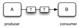 A common problem when designing programs is how to set up a stream of information from a producer module A to a consumer module B, while keeping both A and B decoupled so that each has no dependency on the module they are communicating with. Assuming that the values communicated have some type T, the communication we want can be depicted as follows: