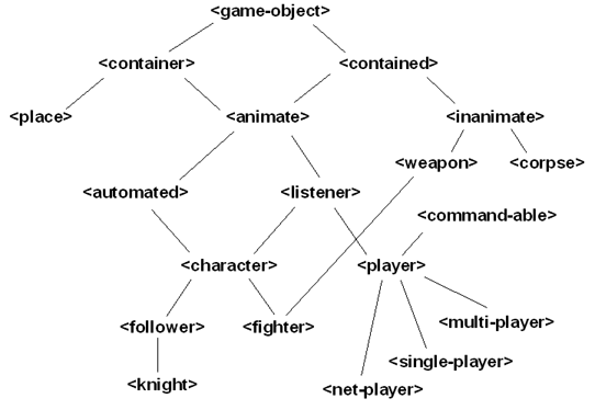 The game consists of a world which contains places, inanimate objects (like books or grenades), animate objects (like the players or the Knights.) Animates can move from room to room, pick up or put down inanimate objects, fight, say things to one another, etc. As a player, you can type commands in to the game which cause your animate to perform certain tasks. Other animates, such as the Knight, are automated and have their own "plans" for moving around in the world and interacting with other animates and inanimates.