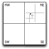 To insert an object at coordinates (x,y), we traverse the quadtree starting from the top node and walk down through the appropriate sequence of child nodes that contain the point (x,y) until we reach a leaf node. This figure depicts the quadtree nodes that we visited in the process of inserting an object located at the black dot.