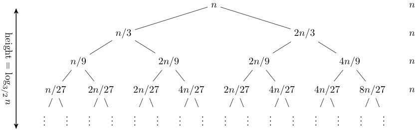 Note that the tree here is not balanced: the longest path is the rightmost one, and its length is log3/2 n. Hence our guess for the closed form of this recurrence is O(n log n).