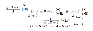 For example, here is a proof of the proposition (A ⇒ B ⇒ C) ⇒ (A ∧ B ⇒ C).