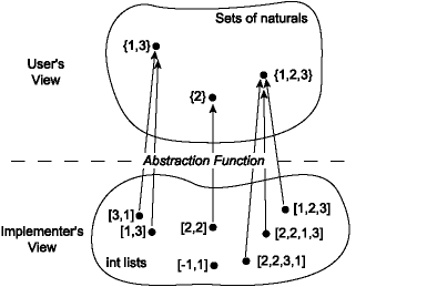 The abstraction function for the second implementation, which does not allow duplicates, hints at an important difference: we can write the abstraction function for this second representation a bit more simply because we know that the elements are distinct.