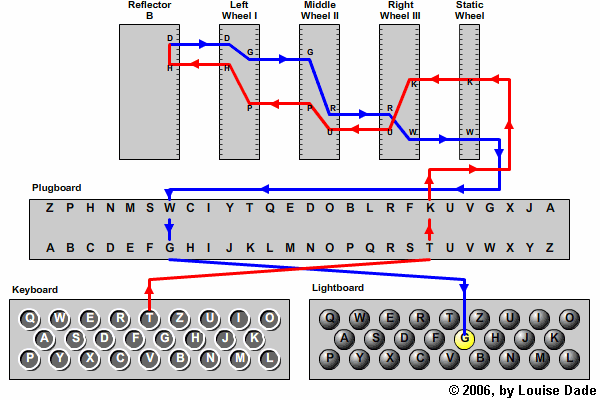 At last, it’s time to encipher an entire string. The order of operations as they occur on the Enigma machine is as follows: