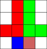 The position of the red-colored L-piece in the initial configuration can then be represented as (0100, 0100, 1100, 0000) (or (4, 4, 12, 0) in decimal), that of the green L-shape as 0010, 0010, 0011, 0000 (decimal: (2, 2, 3, 0)), that of the blue piece as 0000, 0000, 0000, 0100 (decimal: (0, 0, 0, 4)), and that of the brown piece as 0000, 0000, 0000, 0010 (decimal: (0, 0, 0, 2)). To give one more example, the position of the red L-piece in the second diagram can be described by the decimal configuration (12, 8, 8, 0).