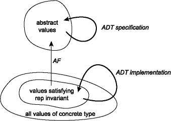 This condition identifies a subset of the space of values of the type used for concrete representations. The idea is that all of the values produced by the implementation will satisfy the representation invariant, and that the abstraction function is defined on all values that satisfy the rep invariant. Therefore the implementation is guaranteed to produce valid concrete values. Because the rep invariant and the abstraction function are so closely linked, they are documented together in the module implementation. The relationship between the representation invariant and the abstraction function is depicted in this figure: