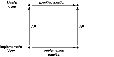 A commutation diagram means that if we take the two paths around the diagram, we have to get to the same place. Suppose that we start from a concrete value and apply the actual implementation of some operation to it to obtain a new concrete value or values. When viewed abstractly, a concrete result should be an abstract value that is a possible result of applying the function as described in its specification to the abstract view of the actual inputs. For example, consider the union function applied to the concrete pair ([1,3],[2,2]), which would be the lower-left corner of the diagram. The result of this operation is the list [2,2,1,3], whose corresponding abstract value is the list {1,2,3}. Note that if we apply the abstraction function AF to the lists [1,3] and [2,2], we have the sets {1,3} and {2}. The commutation diagram requires that in this instance the union of {1,3} and {2} is {1,2,3}, which is of course true.