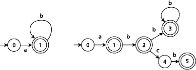 It is conventional to draw finite automata as a graph where the states are drawn as circles and the accept states are drawn as double circles. For example, an automaton that accepts the same strings as the regular expression ab* is shown on the left; the automaton on the right corresponds to the more complex regular expression a(b*|bcb); note that it has four accept states.