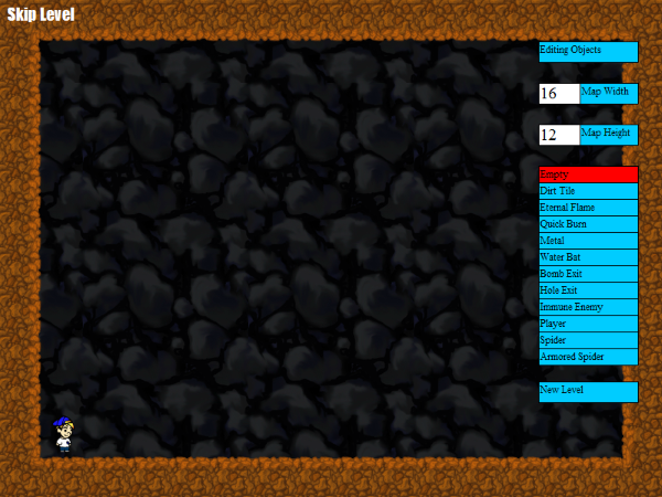 The version of the game on Kongregate is playable (once again, because of Ruffle), but it lacks the level editor. To use the level editor you have to play our private version of PyroKid. You can do that by clicking the image above. That will take you to another web page serving a copy of PyroKid with the level editor. You should see an orange button in the middle of the page. Click on that to start the game. All of your work will be done on the web page (though remember to save your work. There is nothing else for you to download.