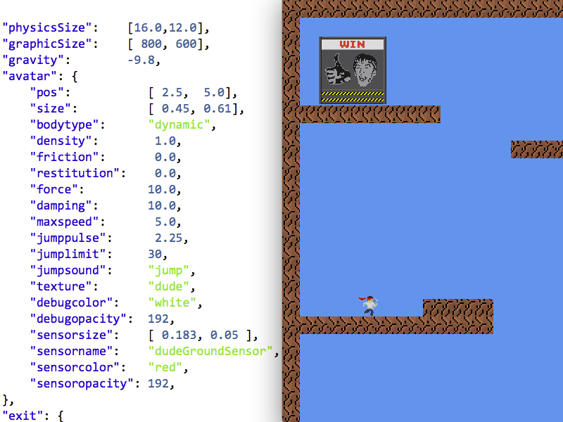 This example shows how to use JSON to define your level format. Modifying the json file allows you to change the level without recompiling the demo; just hit start. |