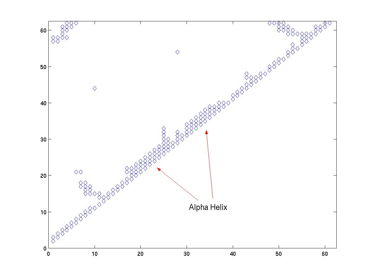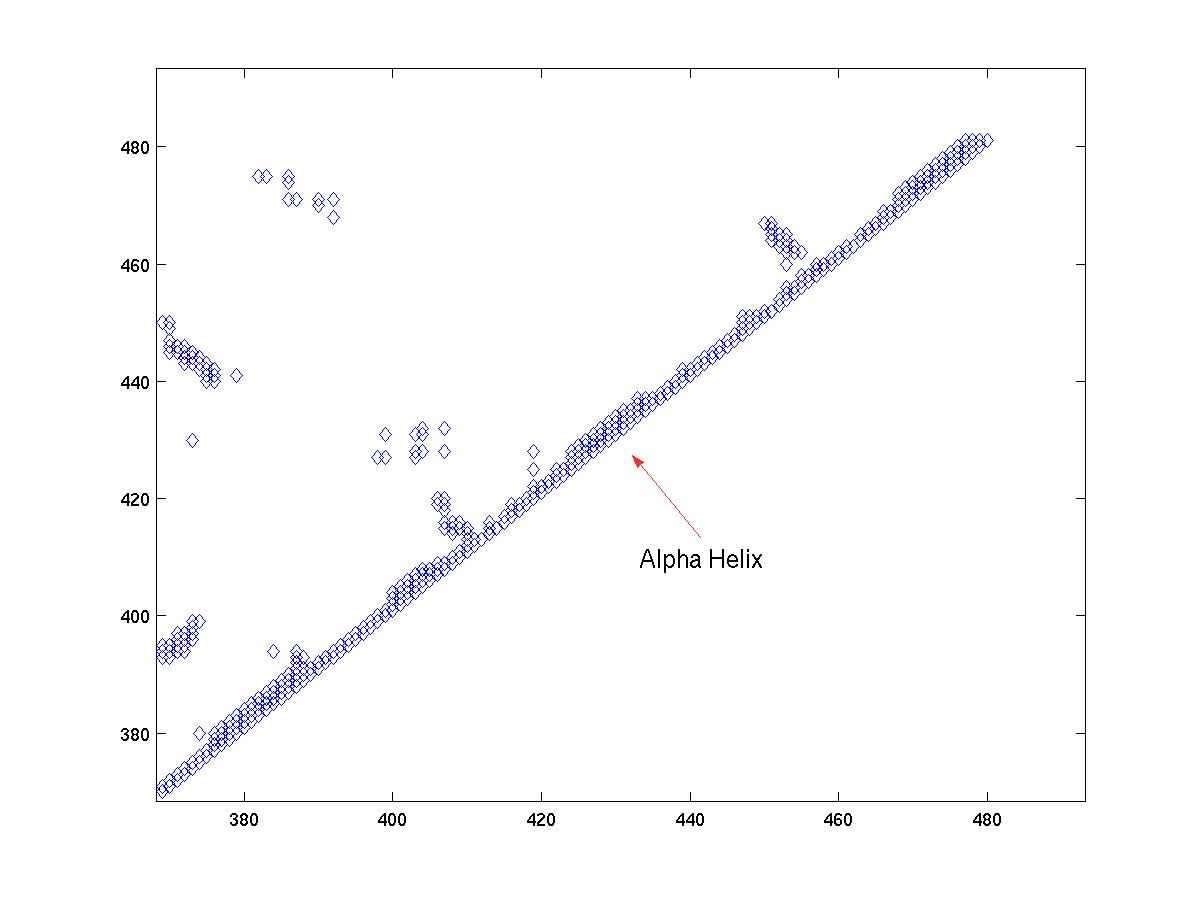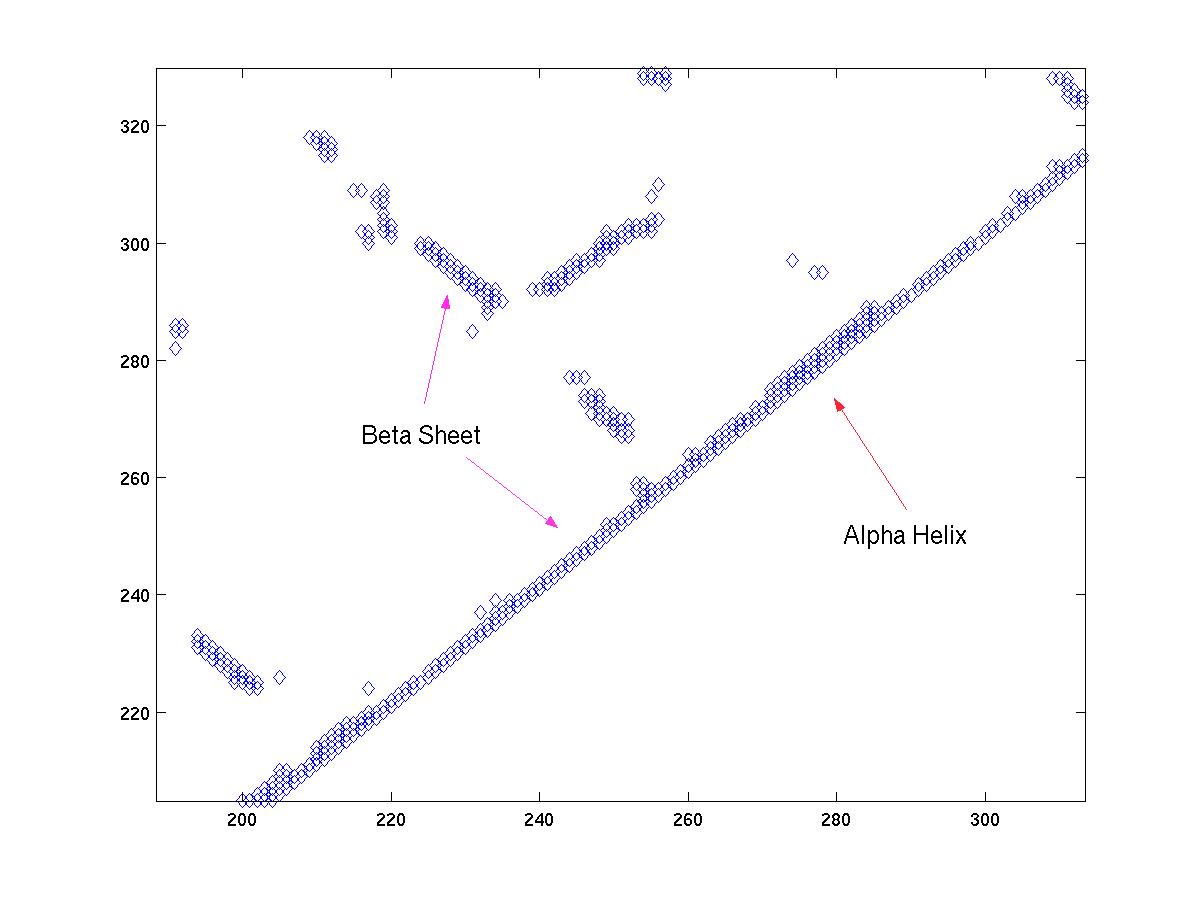 Once we have zoomed in on a region of the main diagonal, we can proceed to identify the structural elements. Alpha helices are compact structures, where several neighboring amino acids are packed close together. Therefore, in an alpha helix, we expect the alpha carbon i to have at least four contacts: i + 1, ..., i + 4. If we see a region along the main diagonal where position i has 4 or more contacts for several consequtive values of i, then that region indicates an alpha-helix. For example, see Figure 3a and Figure 3c.