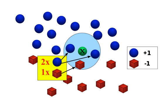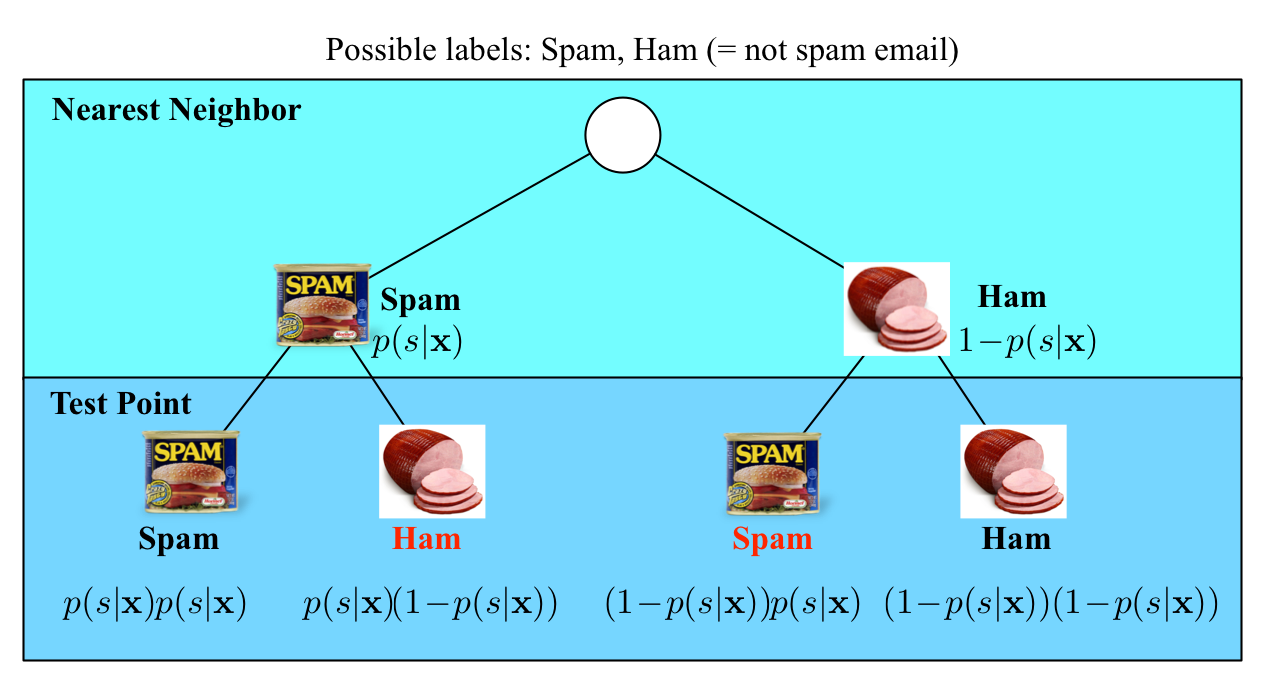 Good news: As \(n \to\infty\), the \(1\)-NN classifier is only a factor 2 worse than the best possible classifier. Bad news: We are cursed!!In the limit case, the test point and its nearest neighbor are identical. There are exactly two cases when a misclassification can occur: when the test point and its nearest neighbor have different labels. The probability of this happening is the probability of the two red events: \((1\!-\!p(s|\mathbf{x}))p(s|\mathbf{x})+p(s|\mathbf{x})(1\!-\!p(s|\mathbf{x}))=2p(s|\mathbf{x})(1-p(s|\mathbf{x}))\) ![]()