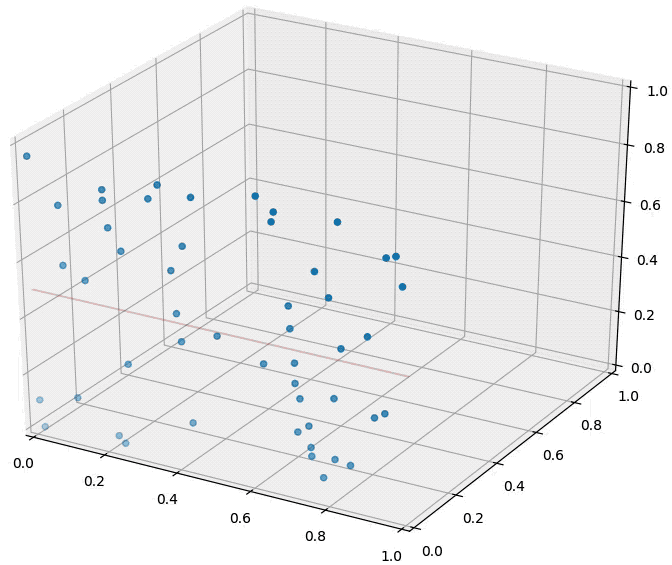 An animation illustrating the effect on randomly sampled data points in 2D, as a 3rd dimension is added (with random coordinates). As the points expand along the 3rd dimension they spread out and their pairwise distances increase. However, their distance to the hyper-plane (z=0.5) remains unchanged --- so in relative terms the distance from the data points to the hyper-plane shrinks compared to their respective nearest neighbors.