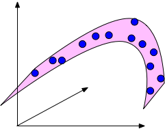 An example of a data set in 3d that is drawn from an underlying 2-dimensional manifold. The blue points are confined to the pink surface area, which is embedded in a 3-dimensional ambient space.