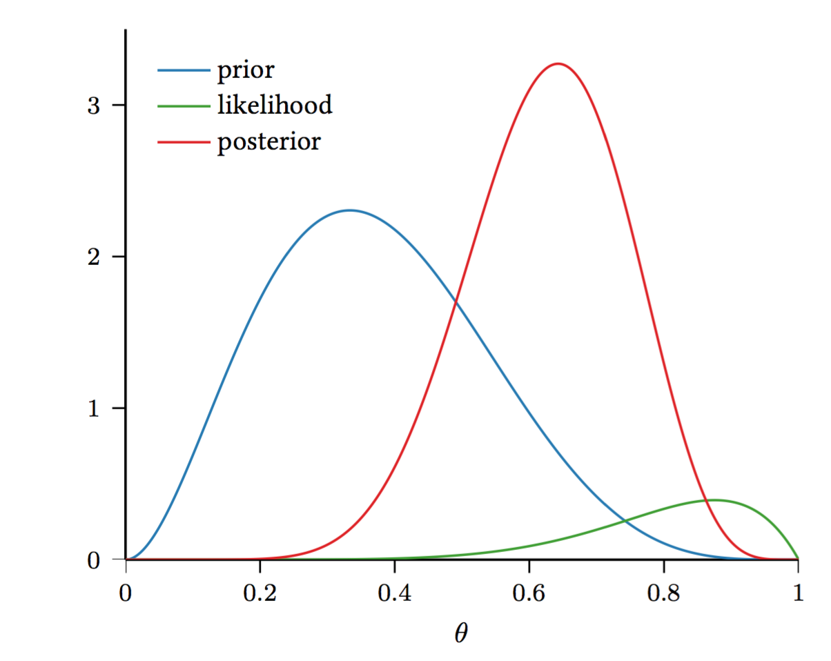 A natural choice for the prior \(P(\theta\)) is the Beta distribution: \begin{align} P(\theta) = \frac{\theta^{\alpha - 1}(1 - \theta)^{\beta - 1}}{B(\alpha, \beta)} \end{align} where \(B(\alpha, \beta) = \frac{\Gamma(\alpha) \Gamma(\beta)}{\Gamma(\alpha+\beta)}\) is the normalization constant (if this looks scary don't worry about it, it is just there to make sure everything sums to \(1\) and to scare children at Halloween). Note that here we only need a distribution over a single binary random variable \(\theta\). (The multivariate generalization of the Beta distribution is the Dirichlet distribution.)