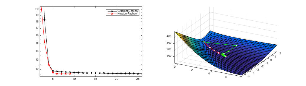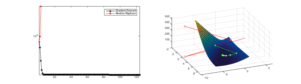 This choice of \(\mathbf{s}\) converges extremely fast if the approximation is sufficiently accurate and the resulting step sufficiently small. Otherwise it can diverge. Divergence often happens if the function is flat or almost flat with respect to some dimension. In that case the second derivatives are close to zero, and their inverse becomes very large - resulting in gigantic steps. Different from gradient descent, here there is no step-size that guarantees that steps are all small and local. As the Taylor approximation is only accurate locally, large steps can move the current estimates far from regions where the Taylor approximation is accurate.