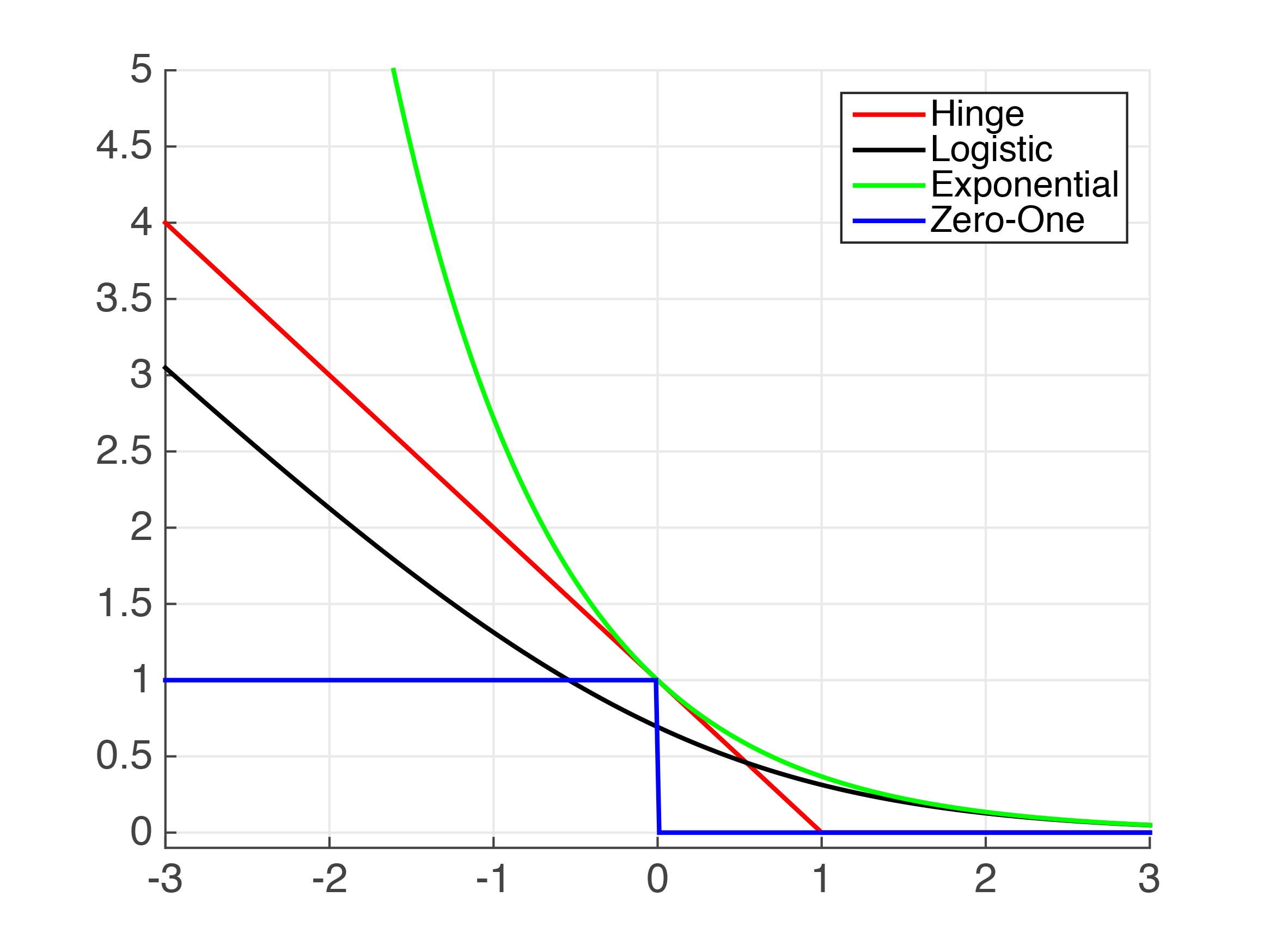 | Exponential Loss \(\left. e^{-h_{\mathbf{w}}(\mathbf{x}_{i})y_{i}}\right.\) | AdaBoost | This function is very aggressive. The loss of a mis-prediction increases exponentially with the value of \(-h_{\mathbf{w}}(\mathbf{x}_i)y_i\). This can lead to nice convergence results, for example in the case of Adaboost, but it can also cause problems with noisy data. | |||||||||||||||