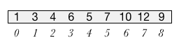 The reason the shape invariant helps is because it makes it possible to represent the binary heap as a resizable array. The elements of the array are “read out” into the heap structure row by row, so the heap structure above is represented by the following array of length 9, with array indices shown on the bottom.
