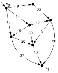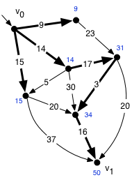 Suppose we run the algorithm on the graph above, with v0 as the only root node. On the first loop interation we put the three successors of v0 in the queue and update their distances accordingly. On the second iteration, we pop the node with the lowest distance (9) and add its own successor to the queue at distance 9+23=32. The new gray frontier consists of the three nodes shown in the figure below.