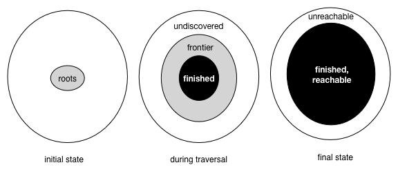 The progress of the algorithm is depicted by the following figure. Initially there are no black nodes and the roots are gray. As the algorithm progresses, reachable white nodes turn into gray nodes and these gray nodes eventually turn into black nodes. Eventually there are no gray nodes left and the algorithm is done.