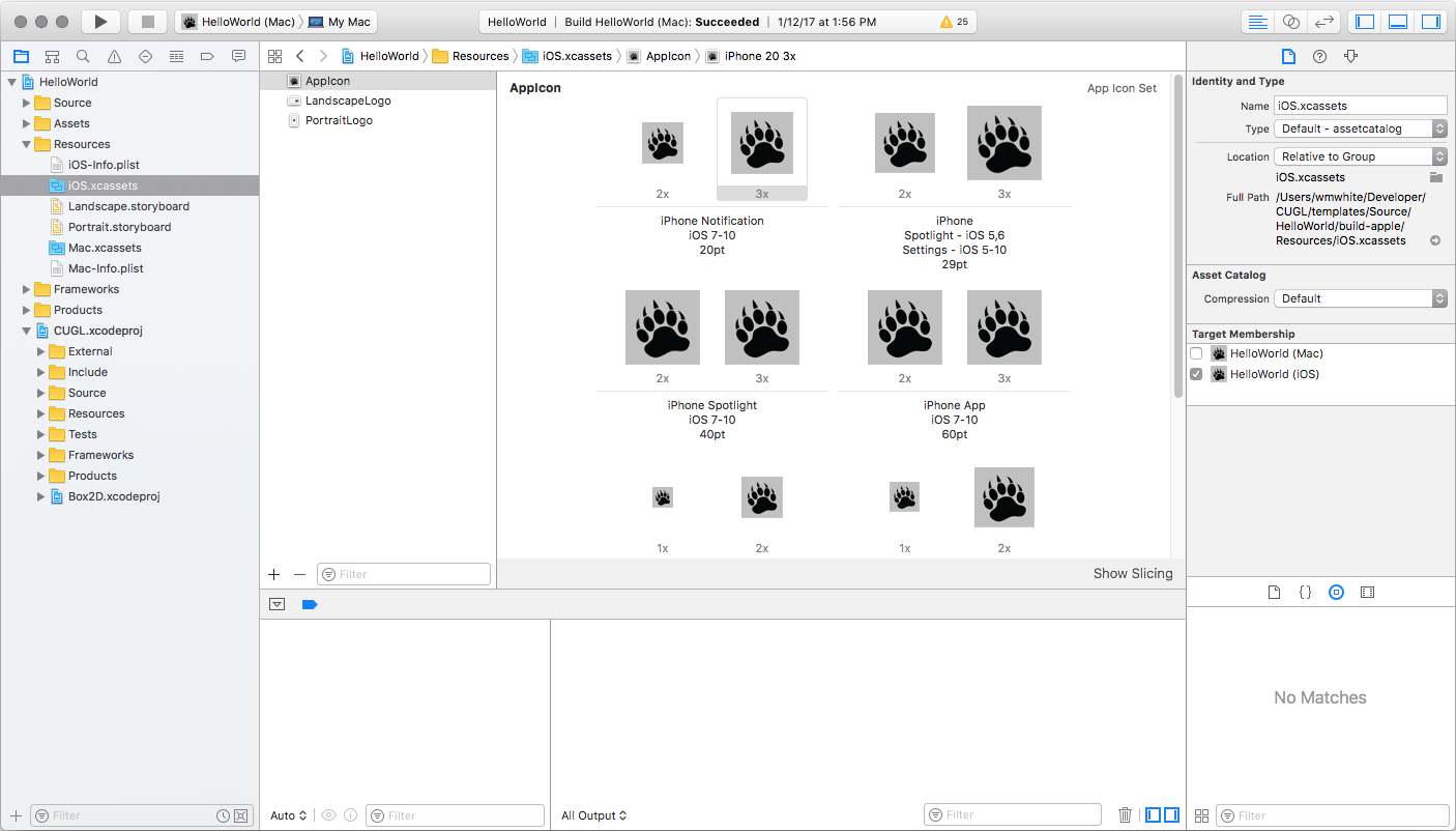 Modifying the Launch AssetsThere are two assets that you cannot control through CUGL: the splash screen and the icon. The splash screen is shown even before the loading screen on the mobile devices, as they have a long initialization time. These are located in the Resources folder (not be confused with the Assets folder). If you click on the iOS.xassets file, you will see options for the icon, a landscape splash screen and a portrait splash screen. When you click on each one, you will also see that they have several options for each available resolution. These items are just PNG files. To set an icon, just drag a PNG on top of a slot, and it will replace it with the new value if possible. The icon must be the correct resolution. A 29pt icon at 3x resolution (the top-right icon) must be 87x87 pixels. If the PNG is not the right size it will be rejected. You must replace all of the icon slots for it to display correctly, so icon creation can be a bit of a chore.