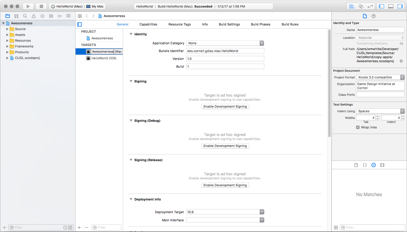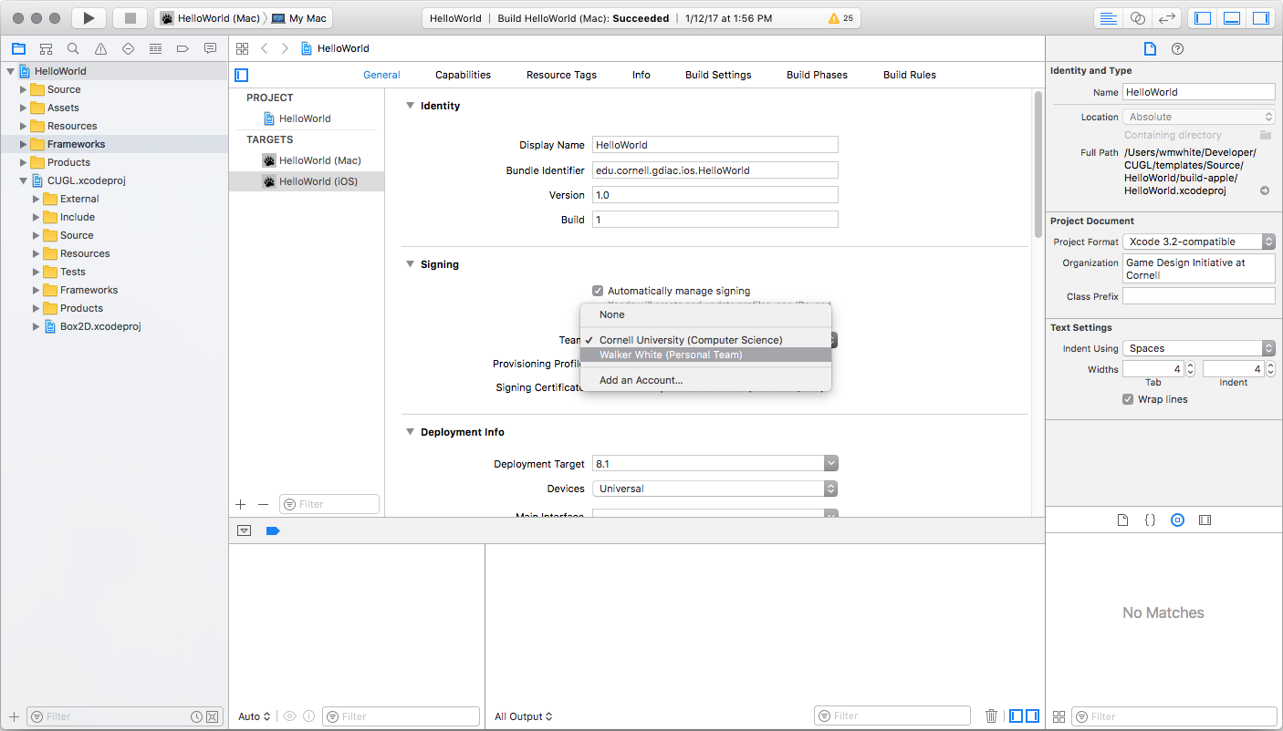 The exception to this rule are classes that are intended to go on the stack, like the math classes Vec2 and Size. Since those are never to combined with new, they do everything in the constructor and have multiple constructor definitions. We will see the reason for this architecture later in class. Even though it may violate some C++ style guides on the Internet, it really is the cleanest way to organize a resource-heavy architecture like a game engine. If you believe that you find a bug in our engine, please let us know via Piazza. Your post should start with the word [BUG]. In addition, you should use the #bug tag. Box2DMany of you have experience with Box2D from the introductory course. The C++ version is the native version, so you can follow the iForce tutorials exactly this time. In addition, there is a lot of functionality in the C++ version that was not available in the Java version. With that said, you do not need to use Box2D directly when writing your game. The 2d/physics package in CUGL is a wrapper around Box2D and provides some basic functionality, at the level of the CS 3152 physics lab. SDLThe SDL base layer is written in pure C with no C++ features at all. SDL requires manual memory management and cannot use smart pointers. In addition, it uses C-style function pointers instead of C++ closures for callback functions. Programming in SDL is very spartan, to say the least. For the most part you should not need to program in SDL. We have wrapped the most important features into CUGL classes for you. However, there are some platform-specific features that are not part of CUGL, such as the JNI interface for Android devices. If you want to use these, you will need to access SDL directly. OpenGLThe key thing to understand about OpenGL programming in CUGL is that there is no one version of OpenGL for all platforms. The desktop platforms support OpenGL 4.x, while the mobile platforms support OpenGLES 3.x. OpenGLES is a essentially a limited version of OpenGL used on iOS and Android. Hence as long as you target OpenGLES, you should be fine and your code will run on all platforms. However there are some exceptions, particularly with the shader languages. OpenGLES requires some extra keywords in the shaders that OpenGL does not. You should talk to the instructor if you really need to get into the details of OpenGL and custom shaders. CUGL for Apple DevicesCurrently, it is only possible to develop for iOS on a Macintosh. While Windows is pushing some cross-platform tools for iOS, they are not currently compatible with our engine (this is a future MEng project). However, you really only need one MacOS machine on your team to deploy to a device. The cross-platform tools mean that everyone else on your team can develop and test on Windows using Visual Studio. If no one on your team has access to a Macintosh, you can still develop for iOS. The CIS undergraduate computing lab in Gates G33 has several Macintoshes (because I specifically asked for them for this class). Most CS and INFO majors should already have access to this lab. If you need access to this lab and do not have it, please contact Amy Elser. Setting Up Your ComputerTo develop for MacOS and iOS, you must have XCode 10 While XCode 9 might be okay, you should avoid anything older than this. One reason for this is that it is much simpler to load on to a device in since XCode 9. But more importantly, iOS 12 requires XCode 10. In general, every time you upgrade your version of iOS, you must upgrade your version of XCode. We recommend that you read the instructions for XCode below for the provided sample HelloWorld project. You should get this project to build for both platforms (MacOS and iOS) before modifying the project. That way you get experience with building a working program before you accidentally break something. Working With XCodeBecause there is a lot of configuration to do, we will not ask you to make a new XCode project. Instead, you should get an existing XCode project and work with that. The engine download will provide you with such a sample project. All of the files that you need to modify will be in the build-apple folder (though you may eventually want to add extra classes and assets to the project). In this folder is an XCode 8 project for building both MacOS and iOS. When you open up the project, it will look like the image below. The important thing to pay attention to are the Build Targets. There are main two targets available: HelloWorld (Mac) and HelloWorld (iOS). You select the current build target from the drop-down menu in the top left, next to the stop button. You will actually see additional builds in the drop-down menu other than the two main targets, but these come from the CUGL support project and may safely be ignored. When you select a build target, you also choose a device. For Mac it will always be your computer. For iOS you will be given a choice of a device or any device currently connected to your computer. That device must be approved for development. You can approve it by choosing Window > Devices. In addition, you must set the build to have proper code signing. Our sample uses the Cornell University account for signing. This is an official iOS Developer account which we can give you access to if you wish. However, this is no longer necessary as of XCode 7 and higher. You may now load it on to your device by choosing Personal Team, as shown below. There is a limit to the number of apps you can load per month using Personal Team signing, but unless you are a TA, this should not be an issue. The XCode Personal Team is as good as anything that Cornell can provide you for free. However, if you want multiplayer support, then one member in your team will need to join the iOS Developer Program, which costs $100 per year. That is because networking requires iTunes Connect, which comes with the developer program and is only available to commercial (not academic) users. This program will also allow yo
