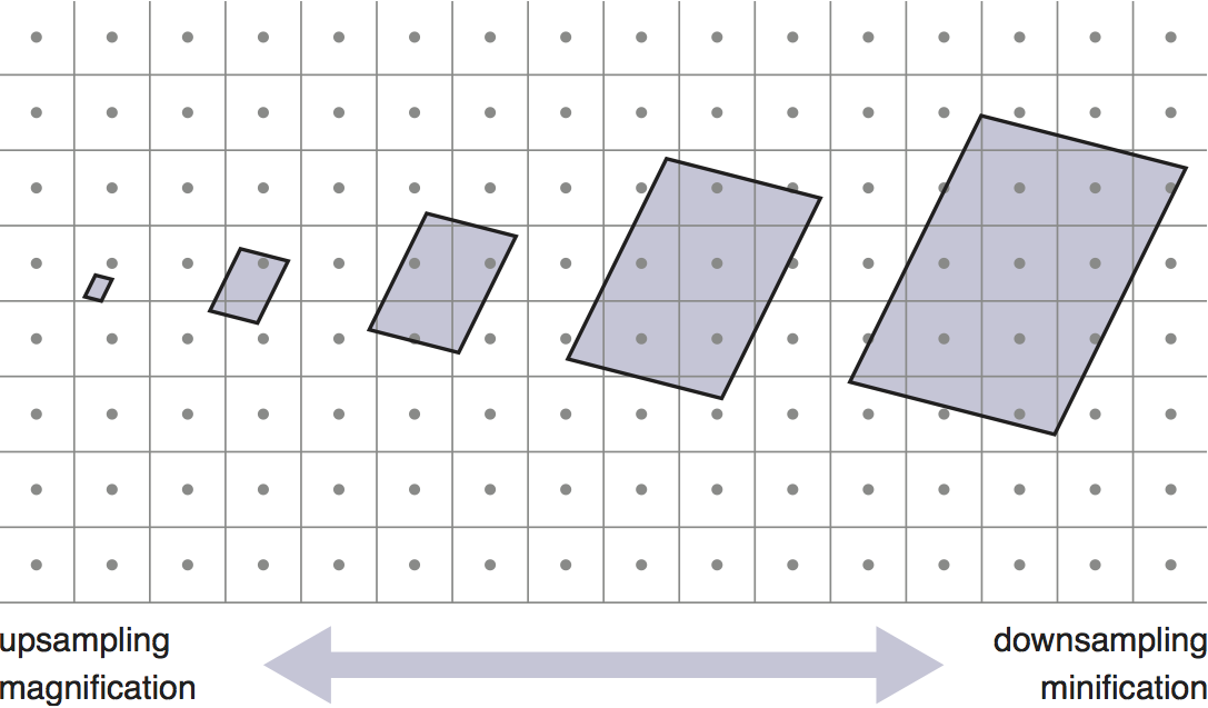 - Also, some pixels may map to a space smaller than a texel (this doesn't contribute to aliasing problems, though).