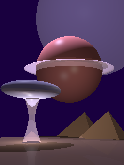 The images below show a UFO. The saucer of the UFO was created by using CSG to render the intersection of two spheres, and the cockpit and science-y under-bulb are each an additional sphere.