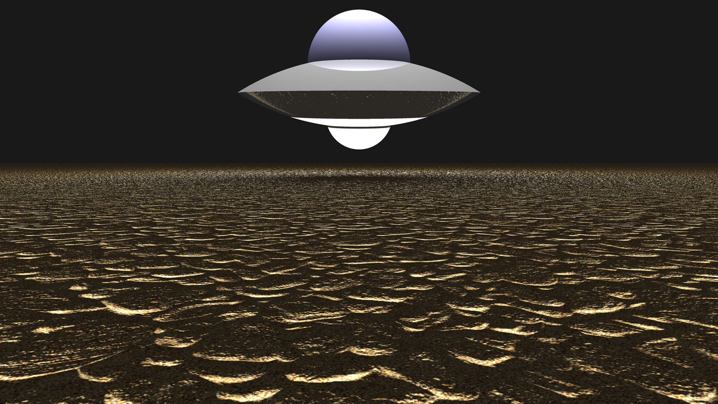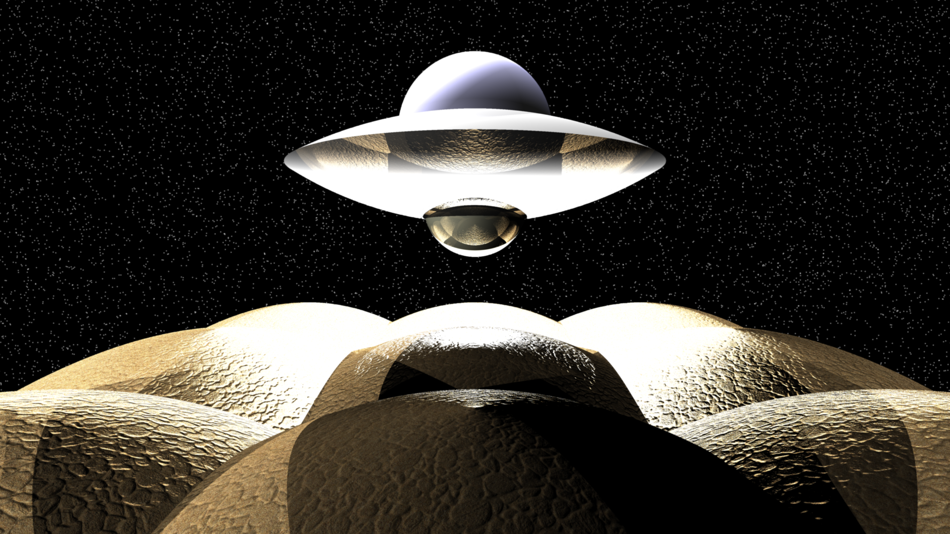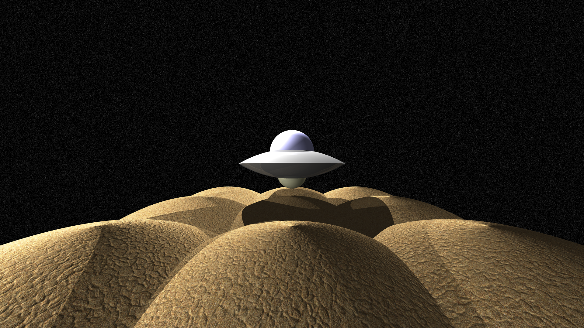 In this third UFO image, the UFO is rendered above sandy hills that are represented by paraboloids with texture and normal mapping. The lighting here is not as good as the one above, but there are more technical features. In this case, this submission would probably do at least as well as the one above, probably better if it included the supplemental CSG demonstration.