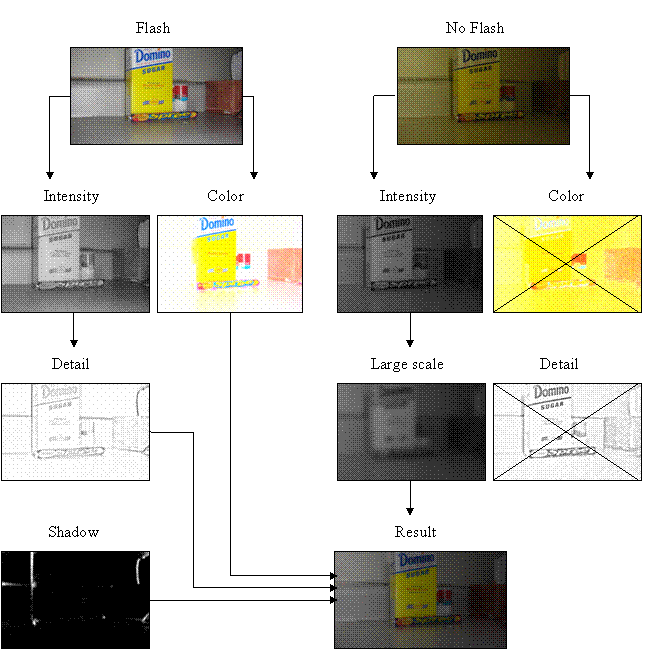 The only images of relevance to us are the large scale image of the no-flash image and the color and details images of the flash image (along with the two input images of course). The color and details images of the no-flash image and the large scale image of the flash image are discarded. The detail and color layer of the flash image is used because it is sharper and white balance is more reliable. The large scale of the no-flash image is used to retain the tone of the original ambient lighting. If we recombine the layers now, we will get a very naive recombination. However, this image will have all the extra shadows that the flash produces in the flash image. So, the next essential step is shadow detection.