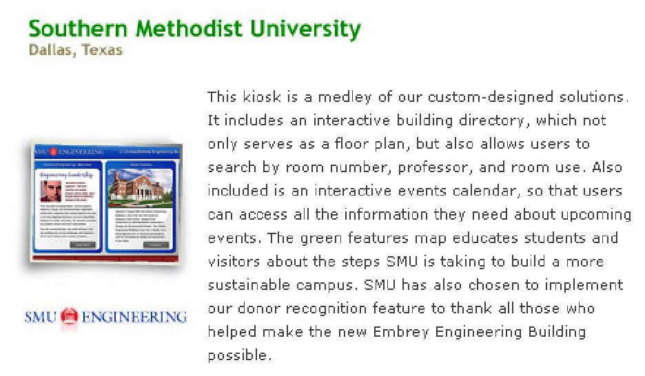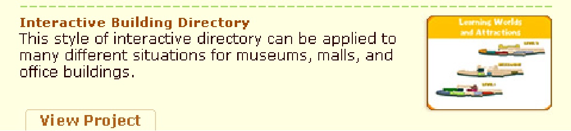 Examples of interactive building directories can be found at: http://www.greentouchscreen.com/pages/newsletter/index.html. Here is one example.
