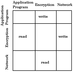 Note that a type enforcement matrix allows us to encode more than a lattice. For example, information flow is not necessarily transitive, and the matrix lets us express this, whereas the lattice does not. Consider the following example: a program sends data to an encryption routine that then sends encrypted data to the network. We would like an application program to be able to write to the encryption routine. The encryption routine should be able to read from the application program and write encrypted data to the network, and the network should be able to read from the encryption routine. The matrix is as follows: