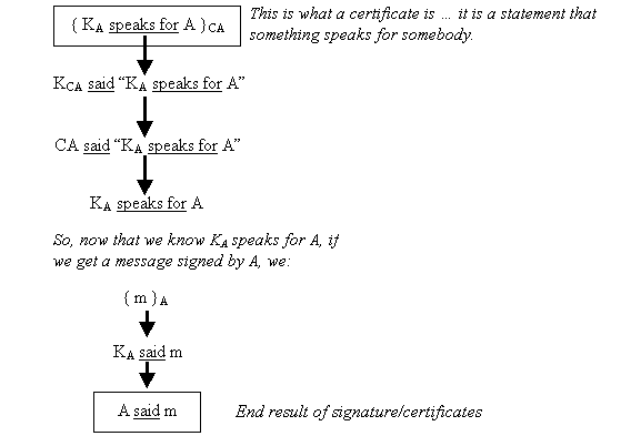 In the first version, names are hierarchical (e.g. A/B/C/D). An e-mail address such as fbs@cs.cornell.edu is represented as edu/cornell/cs/fbs. (In such a scheme, it easy to add a new name uniquely.) The PEM proposal is to have a CA for each subtree of the namespace. That is, a CA named A/B/C is responsible for all names of the from A/B/C/* (where * is a wildcard.) A CA named A/B is responsible for all names of the form A/B/*. A rule for certificates is that the issuer of a certificate must be a prefix of the principal's name in the certificate. That is, CA A/B can issue a certificate for A/B/C/D. Consider the following scenario