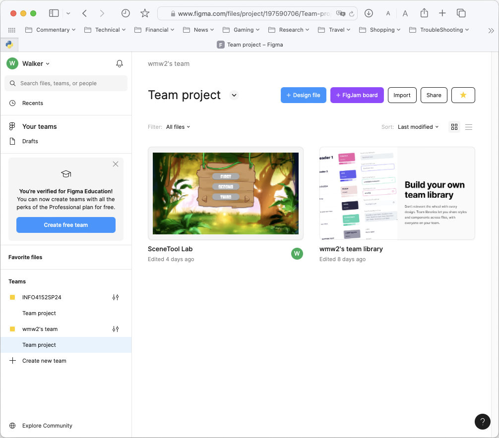 Once you upodate to the Professional Edition, you will also need to create an educational team. Documents in Figma are associated with a team, and only documents saved under that team will have access to developer mode. If you log into Figma from a browser, you will see information about your account.