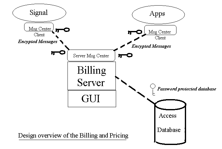 To ensure that messages between the Billing Clients and the Billing Server are not tampered with, a encryption/decryption security method is applied to Billing Messages traveling between MessageCenters. All Billing Messages are a subclass of a BS_EncryptedMsg. This Message contains the pertinent information in a Java String along with a timestamp. When Billing Messages are created, all information is packed into a String and sent to the encryption algorithm located on each Billing Listener. There, a time is stamped onto the object and used as a key to lookup a number in a hashtable that ranges from 1 to 15. This number is used to rearrange the bits in a Java char primitive object which is composed of 16 bits. The encryption is simply to move a specified number of bits from the left of the char to the right. This effectively masks all information in the String object which can now be sent with the BS_EncryptedMsg over the network to the appropriate Message Center destination. Upon arrival, the message is decrypted by using the same lookup timestamp into a similar hashtable to obtain the bits to rearrange. The String is then parsed to obtain the information in the child Message. The hashtable located at every Billing Listener is randomly generated upon startup by using the same seed for the random number generator (this seed being the time when the Billing Server starts). This seed is sent to all clients who are then able to recreate the hashtable for their own use. The seed is then discarded. Using this encryption method, the algorithm for encryption is made unavailable to snoops on the network and is useless without the hashtable. This hashtable is always generated at runtime, not hardcoded in, and thus insuring a little more security.