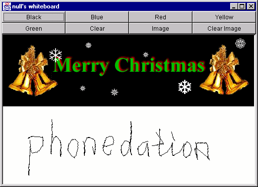 We added this part as a bonus. Since it seems not required for us to do anything more on whiteboard application except simply running it. Though the recommended whiteboard application may satisfy our demo purpose, we decided to do some extra work and tried to make our project more impressive by introducing a new whiteboard written in JAVA and modified it to suit our application. The new whiteboard was downloaded from CMU, and we added a RMI server thread and client thread to each conference group so that different conference group will have separate whiteboard channel. Our efforts will help us get around limitation of local computer domain and build a portable application for Phonedation.