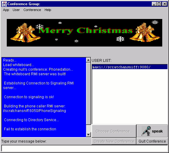 Anyone who wants to join the conference has to be registered. This can be accomplished by choosing "add new user" item from User menu. A dialog box will pop up and the filled information will be sent to the database maintained by the Directory Service.