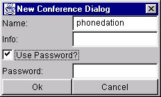 User can create new conference by clicking the "Create New Conference" button. A dialog box will pop out, and a new conference will be created after proper information is filled in. If the "Use Password?" checkbox is chosen, the conference will be private. In such a case,
