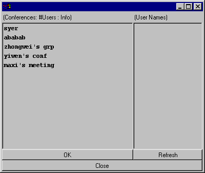 Users can also choose to join an existing conference by clicking "Choose Conference" button. All existing conference names will be shown on the left panel and the user can pick any conference of interest to join. When the existing conference group is clicked, the user names in that group will be displayed on the right panel. Following is a screen shot.