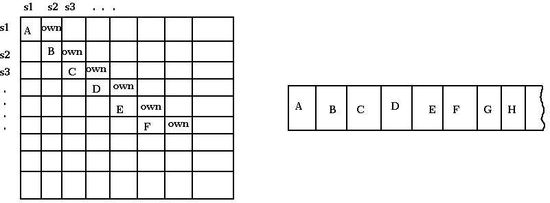 The first step for the encoding is to create the protection matrix from the TM's tape. We encode the contents of the TM's tape on the diagonal of the protection matrix; element [S, S] will contain the Sth tape square. Recall also that subjects and objects aren't ordered, and thus any permutation of rows or columns is an equivalent protection system. We need some way to encode the fact that tape square S1 comes before tape square S2. This is down by making "own" a member of the element [Si, Si+1]. So, the matrix now looks something like: